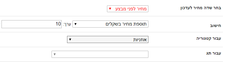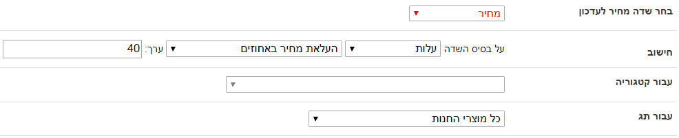 2. עדכון מחיר גורף על בסיס שדה אחר (שדה מחיר אשר נבחר, ומתוכו יהיה החישוב שישפיע על שדה אחר). |