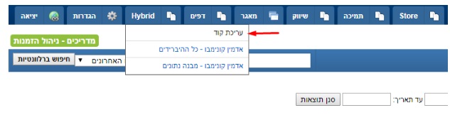 לאחר התחברות למערכת יש לגשת לאיזור Konimbo Hybrid > עריכת קוד.