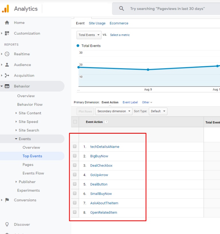 בעת הקמת חשבון גוגל אנליטיקס וביצוע הגדרות המסחר האלקטרוני, מוגדרים האיוונטים הבאים: