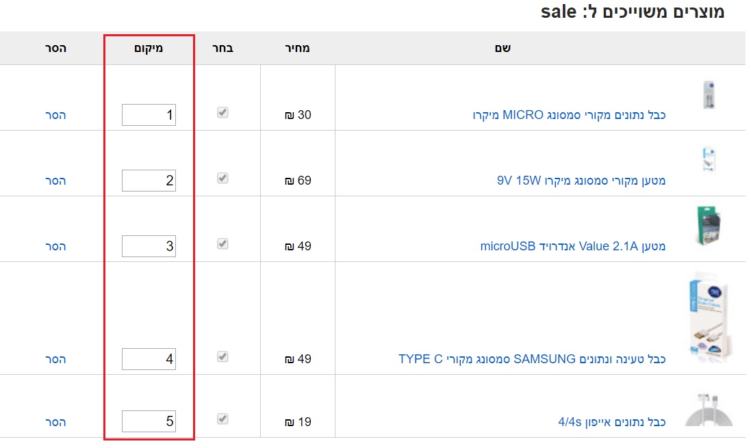 דוגמא לתצוגת מיקום המוצרים בתג בממשק הניהול לאחר ייבוא האקסל