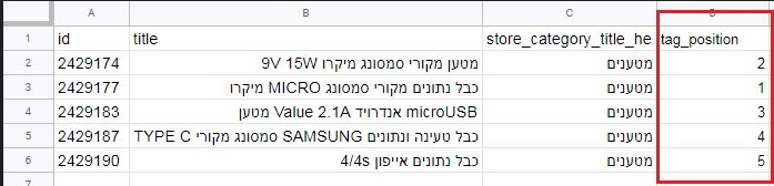 דוגמא לאקסל תג מוצרים עם הוספת עמודה tag_position |