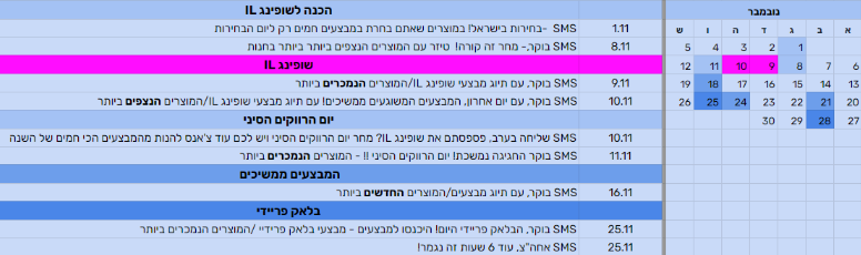 לנוחיותכם הכנו עבורכם תכנית שליחת מיילים וסמסים לחגי נובמבר כדי שתדעו בדיוק אלו מיילים וסמסים ליצור ולמתי תזמן אותם.
